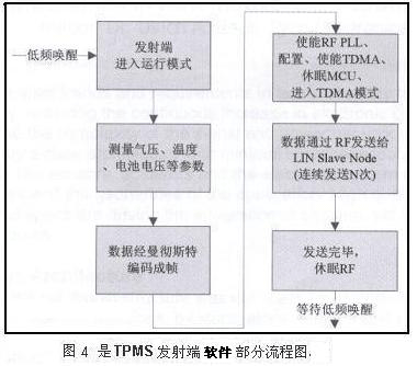 在設計一個運行穩定、功效高的系統時,需要考慮的第一個因素就是軟件。因為車輪模塊通常是用微控制器來執行命令的,所以應采用一種智能化算法實現預期的功效。其次,使用低頻功能是控制TPMS的非常有效的方法。在使用低頻接口時,感應模塊可以始終處于電源關閉模式,只有在收到喚醒信號后,傳感器才會進行測量和數據傳輸。除了降低功耗以外,低頻接口還具備設計靈活性和其他一些優勢。例如,低頻通訊可使系統通過低頻接口向微控制器發送特定命令,以對輪胎進行重新校準和定位。值此以MLX90603帶有LF(Low Frequency)接口為例的發送模塊軟件設計方案作一說明。MLX90603帶有LF(Low Frequency)接口,因此可以在大部分時間內將發射端處于休眠模式,需要時通過低頻信號將其喚醒,進而進行測量并通過TH720x發射芯片將測量得到的數據發送給相應的LIN從節點。圖4是發射端的部分流程圖。本方案中,充分利用了MLX90603 中集成的TDMA(Tag Direct Memory Access)模塊,在MLX90603采集完數據后,配置TDMA、RF所需的寄存器,即可將MLX90603進入Sleep mode,利用TDMA模塊自動把要發射的數據傳輸給RF,以充分節省功耗。由于發射端工作在惡劣環境下,為了保證發送端和接收端進行可靠的數據傳輸,考慮到本應用信息量小、數據簡單的特點,我們采用信息冗余的方法來保證數據的可靠接收,即一幀數據發送N次。根據采集到的數據動態調整發送次數N。