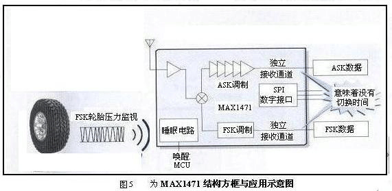 使用MAXl471雙通道接收器同時捕捉兩種信號,即能同時接收ASK和FSK(頻率變換數據),模式間切換時間為零。針對同時需要對 ASK和FSK解碼的低成本系統設計,MAXl471雙模接收器還可進行自輪詢,器件可保持長達8分鐘的睡眠模式,并可喚醒微處理器,以進一步節省能源。 MAXl47l工作于300MHz至450MHz,包括內置的42dB(兆型值)鏡頻抑制混頻器,不需常見的SAW濾波器。MAXl471內置一個可用于 3.3V或5V的穩壓器,可在低至2.4V的電壓下工作。圖5為MAX1471結構方框與應用示意圖,從圖中表看出MAX1471也可用于汽車輪胎壓力監視系統中接收器。