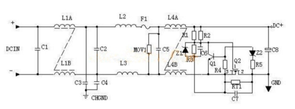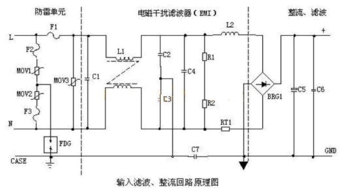 輸入分析:圖中C1、L1、C2、C3組成的濾波電路是對(duì)輸入電源的電磁噪聲和雜波信號(hào)進(jìn)行抑制;防止對(duì)電源干擾和對(duì)電網(wǎng)干擾;RT1的作用是防止浪涌電流;保護(hù)后級(jí)電路正常工作。