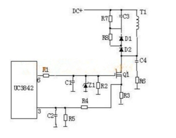 圖中R4、C3、R5、R6、C4、D1、D2組成緩沖器再和開關(guān)MOS管并接;使開關(guān)管電壓應(yīng)力、EMI減少;這些元件組合一起,很好地吸收尖峰電壓和電流。從R3測(cè)得的電流峰值信號(hào)參與當(dāng)前工作周波的占空比控制,因此當(dāng)前工作周波的電流限制;當(dāng)R5上的電壓達(dá)到1V時(shí),UC3842停止工作,開關(guān)管Q1立即關(guān)斷。R1和Q1中的結(jié)電容CGS、CGD一起組成RC網(wǎng)絡(luò),電容的充放電直接影響著開關(guān)管的開關(guān)速度。R1過(guò)小,易引起振蕩,電磁干擾也會(huì)很大;R1過(guò)大,會(huì)降低開關(guān)管的開關(guān)速度。
