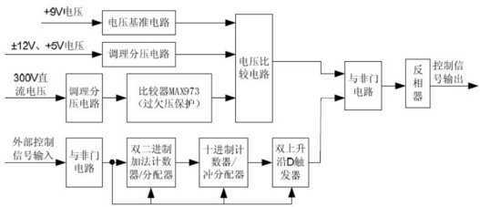 控制保護(hù)電路又分為控制以及過欠壓保護(hù)電路,控制電路用來對可控直流電壓的輸出進(jìn)行控制,過欠壓保護(hù)電路用來對三個DC-DC的過欠壓保護(hù)作用。