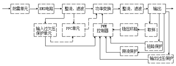 開關電源模塊主要電路是由輸入EMI、整流濾波電路、功率變換電路、PWM控制器電路、輸出整流濾波電路等組成。詳細如下圖所示: