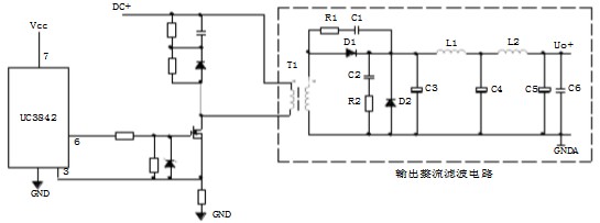 上圖為正激式輸出整流濾波電路:T1為開關變壓器,其初極和次極的相位同相。D1為整流二極管,D2為續流二極管,R1、C1、R2、C2為削尖峰電路。L1為續流電感,C4、L2、C5組成π型濾波器。