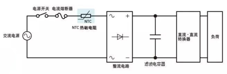 交流轉直流電源模塊是指由交流-直流整流電路、直流-直流轉換器及少量元器件組成的小型開關電源,接一個NTC熱敏電阻可以有效地抑制在通電時施加到輸入和輸出電容上的浪涌電流。如下圖所示:
