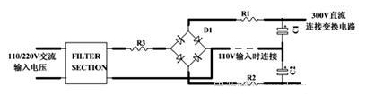 上圖所示為串連電阻法沖擊電流控制電路(適用于橋式整流和倍壓電路,其沖擊電流相同),對于110V、220V雙電壓輸入電路,應該在R1和R2位置放兩個電阻,這樣在110V輸入連接線連接時和220V輸入連接線斷開時的沖擊電流一樣大。對于單輸入電壓電路,應該在R3位置放電阻。