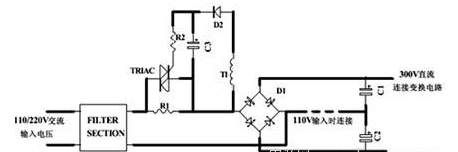 對于大功率AC/DC模塊電源,沖擊電流限制器件在正常工作時應該短路,這樣可以減小沖擊電流限制器件的功耗。如下圖所示:選擇R1作為啟動電阻,在啟動后用可控硅將R1旁路,因在這種沖擊電流防止電路中的電阻R1可以選得很大,通常不需要改變110V輸入倍壓和220V輸入時的電阻值。圖中所畫為雙向可控硅,也可以用晶閘管或繼電器將其替代。
