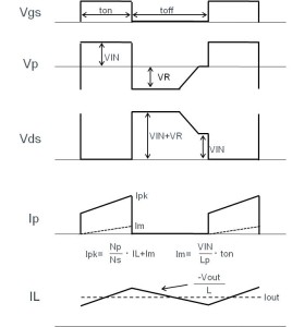 工作模式如下。MOSFET為ON時(shí),二極管D1為ON,經(jīng)由電感供給電流至負(fù)載端。MOSFET為OFF時(shí),蓄積在電感的電能經(jīng)由二極管D2供給電流至負(fù)載端。各部的波形如下圖所示。