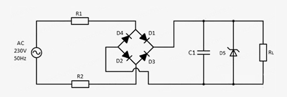 AC-DC電源電阻降壓電路拓撲如上所示,其中電阻R1是降低大部分輸入電源電壓的關鍵元件。現在要做的是計算R1的值以降低電壓,從而在特定電流值下獲得所需的負載兩端電壓。該電路首先通過R1分壓,之后通過橋式整流器將交流電轉換為直流電,然后是電容濾波和齊納穩壓二極管進行穩壓輸出。